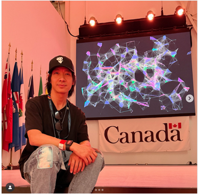 ape man), s'inspire de sa naissance sous le signe du singe dans le zodiaque chinois. Il a également été le premier créateur en résidence à Bibliothèque et Archives Canada, où ses œuvres d'art génératif ont été présentées au pavillon du Canada à l'Expo Osaka 2025 (photo ci-dessus).
